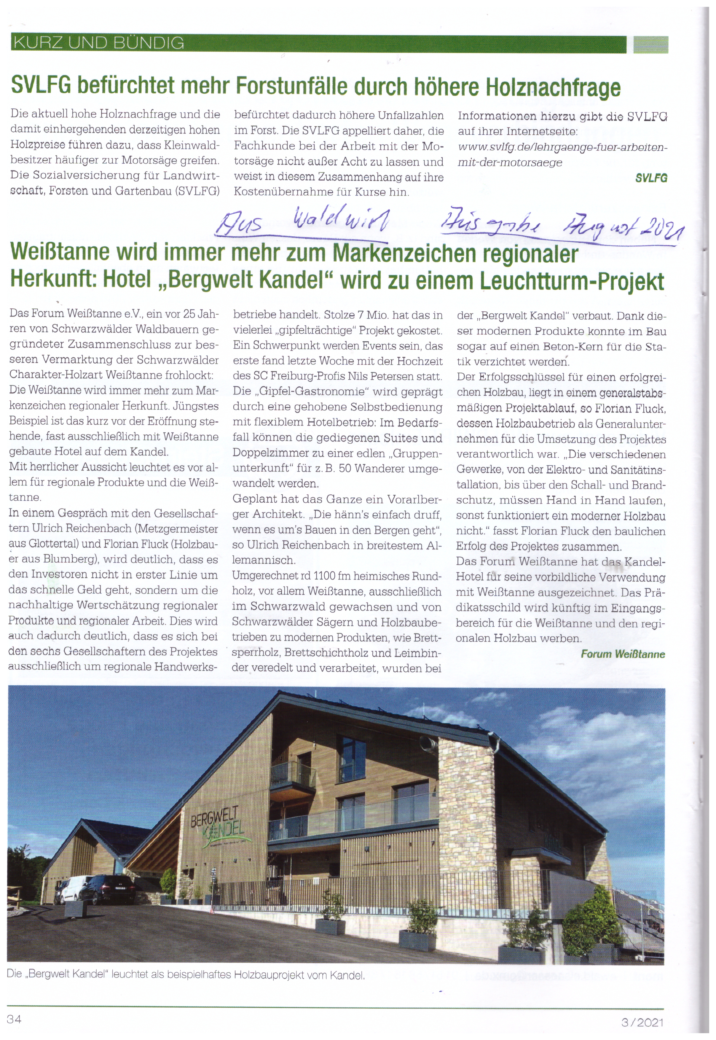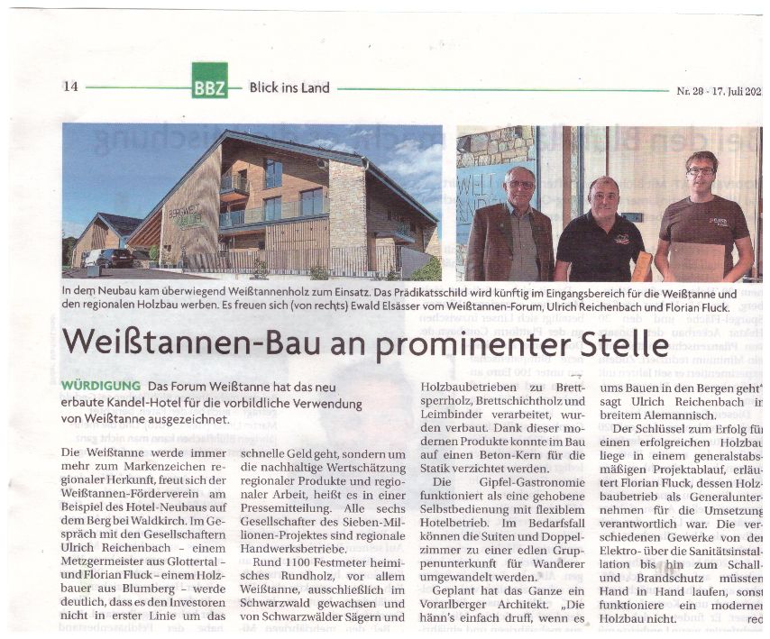 Das Forum Weißtanne e.V. frohlockt: Die Weißtanne wird immer mehr zum Markenzeichen regionaler Herkunft. Jüngstes Beispiel ist das kurz vor der Eröffnung stehende, fast ausschließlich mit Weißtanne gebaute Hotel auf dem Kandel. Mit herrlicher Aussicht leuchtet es vor allem für regionale Produkte und die Weißtanne.
