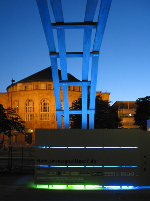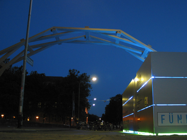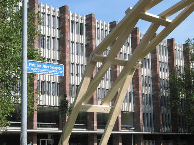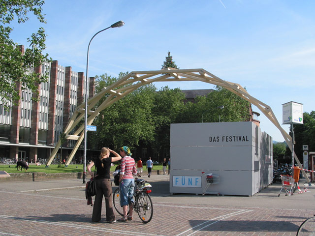 Die Steck-Konstruktion des Universalgenies wurde von jungen Zimmermännern über den Platz der alten Synagoge vor der Universität Freiburg gespannt. Seitdem ist die hölzerne Brücke alljährlich auf dem Freiburger Zeltmusikfestival zu bestaunen.