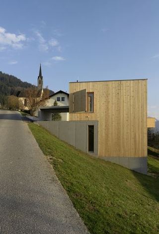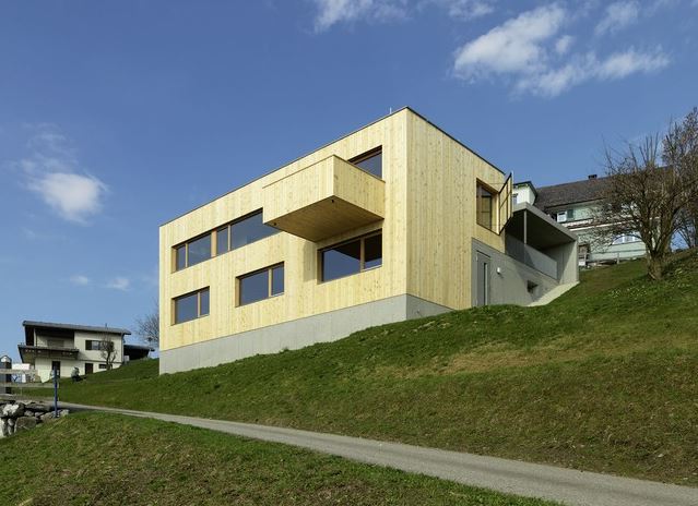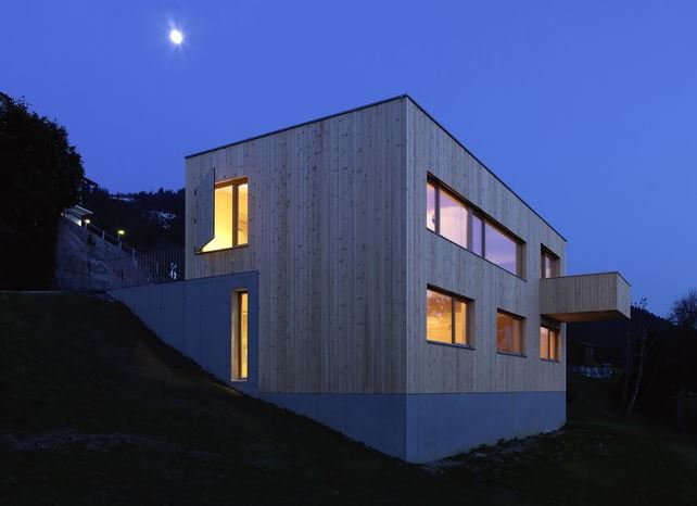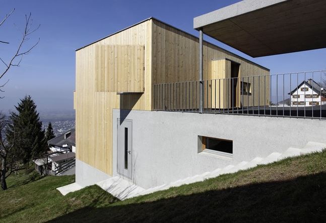 Haus mit Weitblick: Das malerisch oberhalb der Stadt Dornbirn gelegene Grundstück bietet einen einzigartigen Blick vom Bodensee bis tief in das Schweizer Rheintal. Das äußere Erscheinungsbild und die Positionierung des kompakten Holzhauses sind direkter Ausdruck des