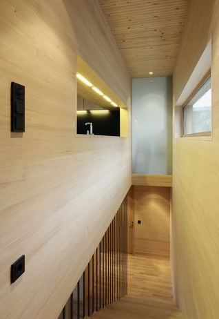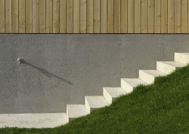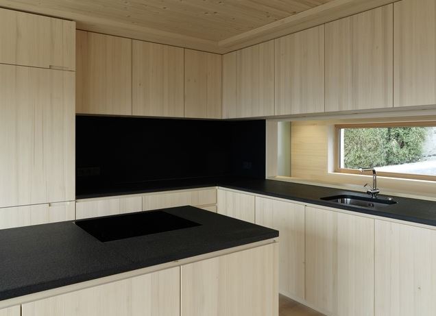 Die Innenräume des Hauses sind in Holz ausgebaut. Die Haptik der größtenteils unbehandelteln Holzoberflächen, ihr angenehmer Geruch und das "warm" reflektierte Licht verleihen den Räumen eine sinnliche Atmosphäre. Um die Blicke weg vom Nachbarhaus bzw. der anliegenden Straße und hin zu den Schweizer Bergen bzw. zum Bodensee zu richten, wurde an der Süd- und Nordfassade jeweils ein großer, schwenkbarer Laden angebracht, der in geöffnetem Zustand wie eine Scheuklappe funktioniert. So kann man nun beispielsweise in der Badewanne liegen und dabei (von Einblicken ungestört) den Blick auf den Bodensee genießen. Das hoch gedämmte Haus wurde als Niedrigenergiehaus konzipiert und verfügt über eine Solaranlage zur Warmwasserbereitung bzw. einen Erdwärmetauscher zur Beheizung. Um die Dachfläche, die als fünfte Fassade von oberhalb deutlich sichtbar ist, ins umgebende Gelände zu integrieren, wurde das Dach extensiv begrünt.