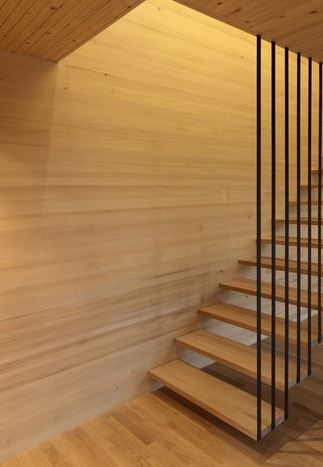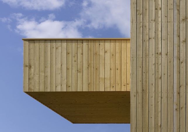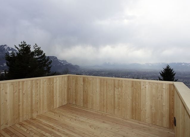 Entwurfsziels ein Maximum an Aussicht, Sonneneinfall und Privatsphäre zu erhaschen. Ein frei auskragender Balkon (reine Holzkonstruktion) ragt wie eine Schublade aus dem Gebäude und bietet einen einzigartigen und geräumigen Sitzplatz in schwindeleregender Höhe.