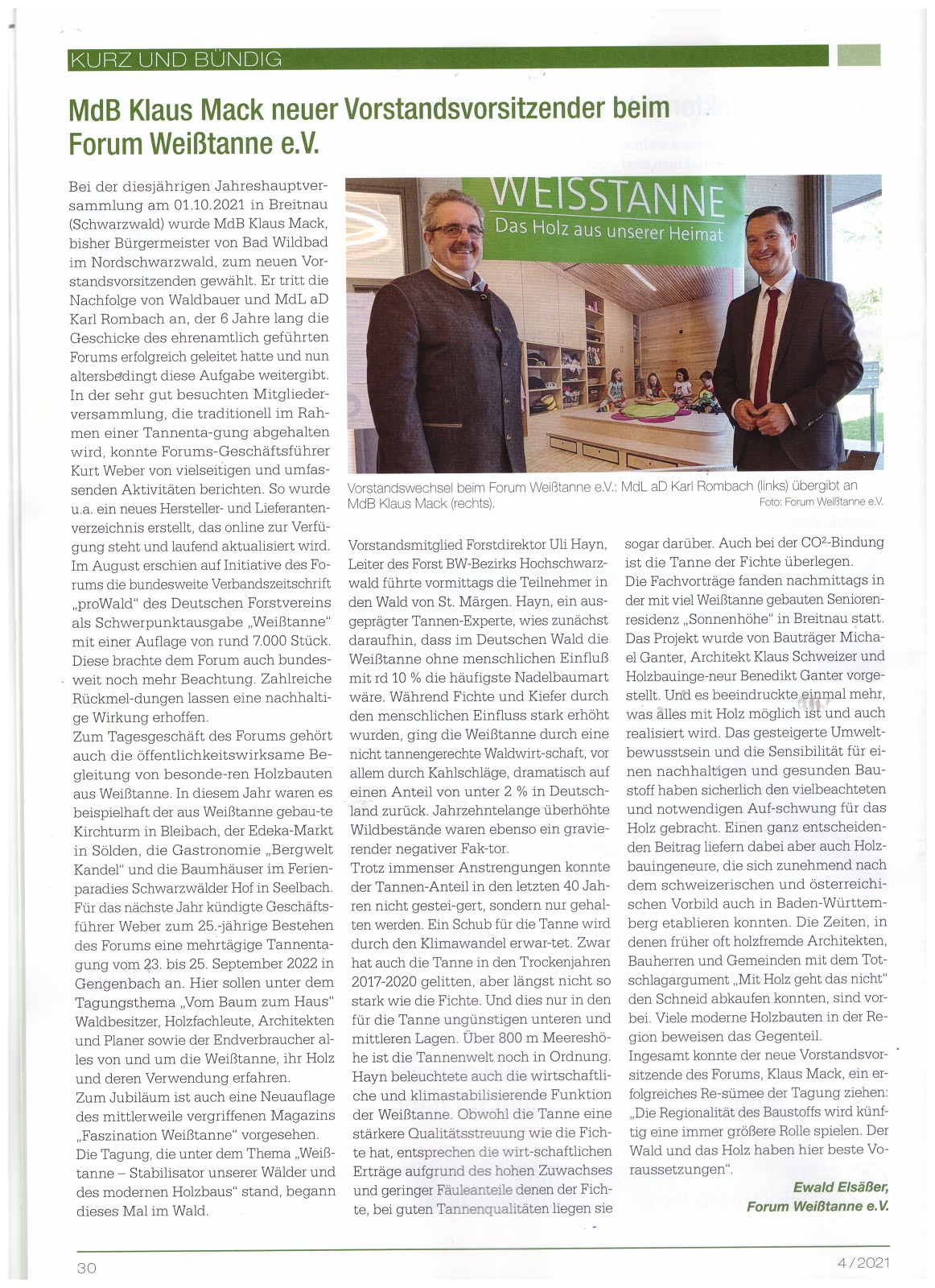 Bei der diesjährigen Jahreshauptversammlung am 01.10.2021 in Breitnau (Schwarzwald) wurde MdB Klaus Mack, bisher Bürgermeister von Bad Wildbad im Nordschwarzwald, zum neuen Vorstandsvorsitzenden gewählt. Er tritt die Nachfolge von Waldbauer und MdL aD Karl Rombach an, der 6 Jahre lang die Geschicke des ehrenamtlich geführten Forums erfolgreich geleitet hatte und nun altersbedingt diese Aufgabe weitergibt.