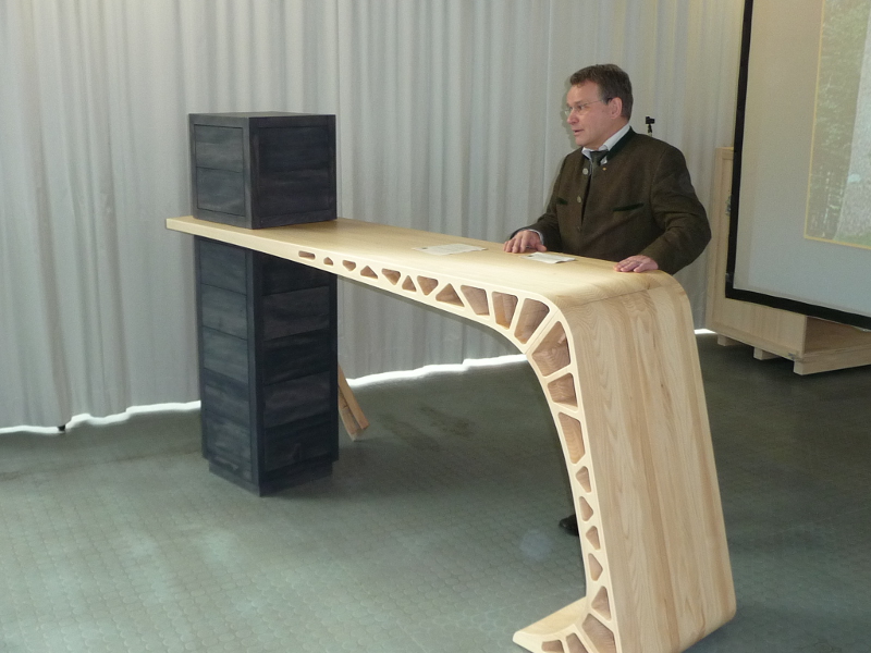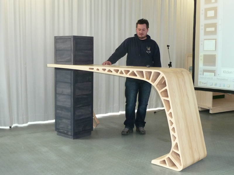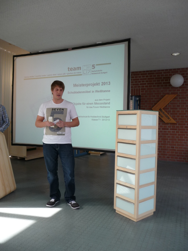 Das Forum Weißtanne e.V. darf sich über neue und exklusive Messe-Möbel freuen! Am 10. April 2013 präsentierten Meisterschüler der Gewerblichen Schule für Holztechnik in Stuttgart den in einer Projektarbeit gestalteten Messestand aus Weißtanne.